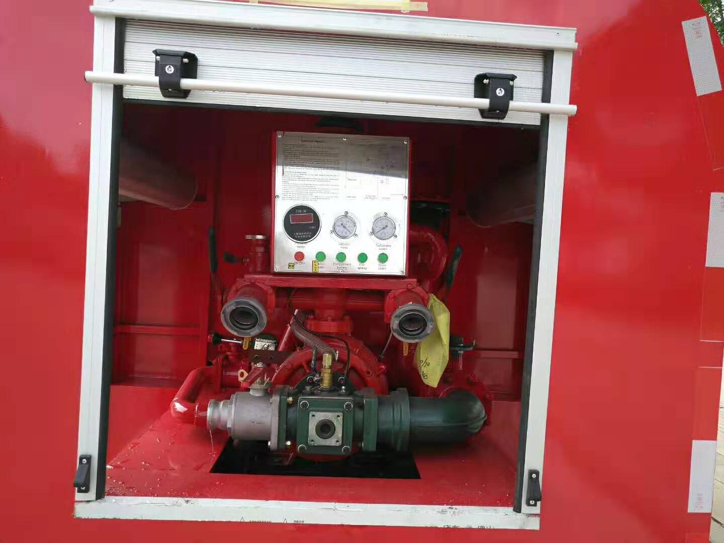整車安裝了消防專用夾心式取力器,正規(guī)消防泵和消防炮,消防炮流量大,每秒20L,射程遠,達45米左右,充分展現(xiàn)了消防滅火功能。